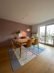 Auch in der offenen Designer-Küche mit Spülmaschine und Backofen finden Sie alle notwendigen Utensilien und genügend Stauraum, um es sich gemütlich zu machen. Im selben hellen Raum steht ein großer Esstisch, der zum Verweilen einlädt. Bei gutem Wetter können Sie ebenfalls den angrenzenden großen Balkon mit Liege und Stühlen geniessen.