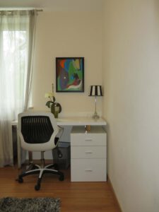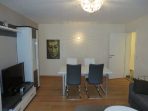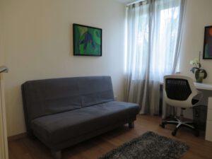 An den Eingangsbereich mit Garderobe schliesst sich die großzügige Küchen an, selbstverständlich komplett ausgestattet unter anderem mit einem Kühlschrank, Spülmaschine, Waschmaschine, Herd und vielem mehr. Alles notwendige Geschirr ist ebenfalls vorhanden. Das angrenzende sehr helle Wohnzimmer bietet Platz für eine bequeme Couch und einen großen Esstisch. Über das Wohnzimmer hat man ebenfalls Zugang zum Balkon. Das Schlafzimmer verfügt über viel Stauraum und ein großes Doppelbett. Im Arbeitszimmer gibt es eine Schlafcouch und eine kleine Arbeitsecke, dieses Zimmer kann im Bedarfsfall natürlich auch als Kinderzimmer genutzt werden. Auch hier gibt es viel Stauraum für Kleidung oder Arbeitsunterlagen, sollte das Zimmer als Home-Office dienen. Schnelles WiFi ist verfügbar.