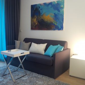 Vollständig möbliert ist das Apartment mit einem vollwertigen Bett, zusätzlich gibt es ein Schlafsofa, selbstverständlich auch einen Couchtisch und zwei bequeme Sessel. Ebenfalls im Wohn- und Schlafbereich befindet sich ein modernes TV Entertainment Paket. Im angeschlossen Gang findet sich in den hochwertigen Einbauschränken genügend Stauraum für Kleidung und zum Beispiel Koffer.
